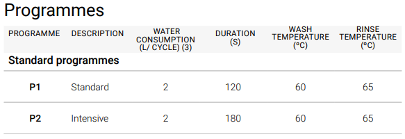 P1 (Стандартна): 120s (2 л./цикъл при 2 бара, Температура на измиване: 60ºC, Температура на изплакване: 65ºC)
