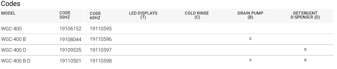 2. Модел с дренажна помпа: WGC-400 B (Мръсната вода за измиване се оттича частично преди изплакване, което позволява: 1/Избягване на ненужно разхищение на препарат чрез по-бавно замърсяване на водата. 2/Намаляване на разходите за енергия по време на фазата на нагряване на водата за измиване чрез непрекъснато регенериране на водата за измиване.)