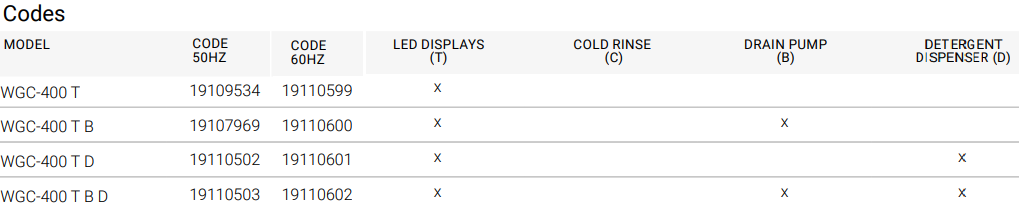 2. Модел с дренажна помпа: WGC-400 T B (Мръсната вода за измиване се оттича частично преди изплакване, което позволява: 1/Избягване на ненужно разхищение на препарат чрез по-бавно замърсяване на водата. 2/Намаляване на разходите за енергия по време на фазата на нагряване на водата за измиване чрез непрекъснато регенериране на водата за измиване.)