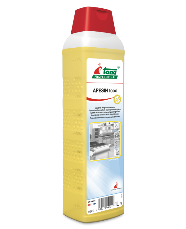 APESIN food от Tana Professional е течен, бързодействащ дезинфектант, създаден за професионална хигиена в кухни, столови и хранително-вкусова промишленост. Благодарение на киселинната си формула, той премахва мазнини, протеинови остатъци, варовик и микробни замърсявания, като осигурява безопасна и бърза повторна употреба на обработените повърхности.