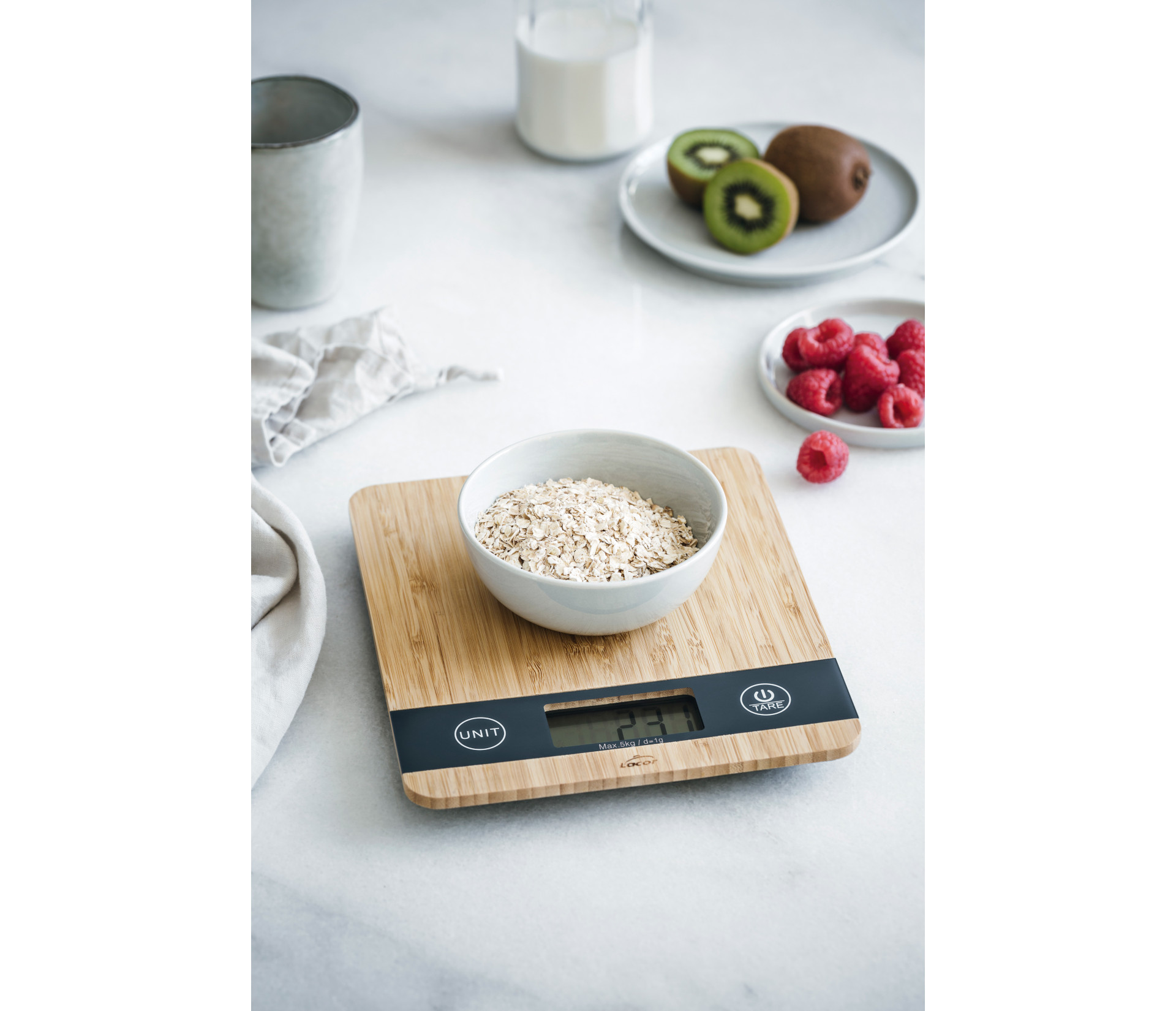 Universal stylish bamboo kitchen scale - with a capacity of 5 kg, accuracy of 1 g, LCD display