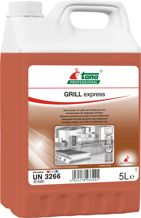 GRILL express by Tana Professional is a powerful cleaner designed to tackle the most stubborn grease and burnt-on dirt in professional kitchens. Thanks to its excellent adhesion to vertical surfaces and its self-acting action, the product provides optimal results without the need for aggressive scrubbing.