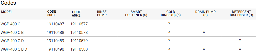 - Model with drain pump: WGP-400 C B (the dirty wash water is partially drained before rinsing, which makes it possible: ·1/Avoid useless waste of detergent by slower soiling of the water. 2/Reducing energy costs during the heating phase of the wash water by continuously regenerating the wash)
