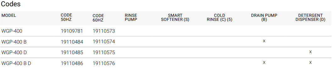 2. Model with drain pump: WGP-400 B (the dirty wash water is partially drained before rinsing, which makes it possible: ·1/Avoid useless waste of detergent by slower soiling of the water. 2/Reducing energy costs during the heating phase of the wash water by continuously regenerating the wash)