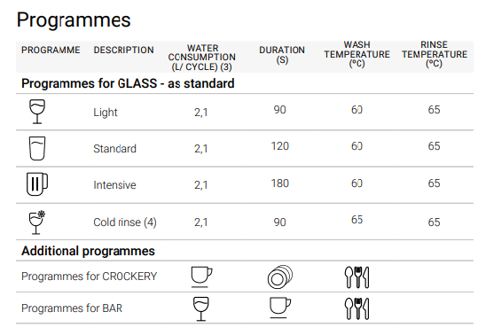 - User-selectable programs according to the washing equipment (glasses, dishes and accessories) and machine-specific programs.