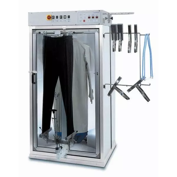 - The steam cabinet is supplied with a trouser ironing attachment and a form for finishing jackets, coats, dresses, etc. as standard.