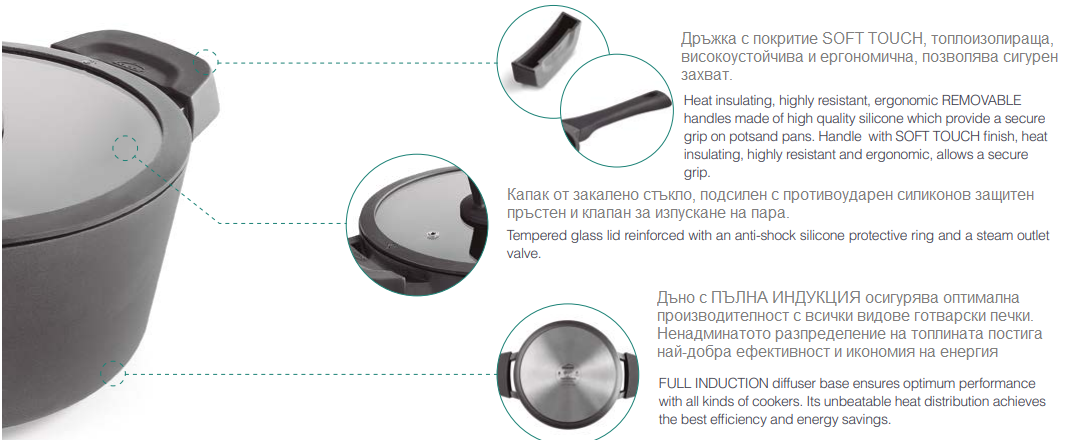 - Removable handles made of high-quality silicone - heat-insulating, highly resistant and ergonomic, allowing a secure grip.