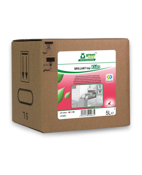 BRILLANT topKliks by Green Care Professional is a highly effective rinse aid designed for medium and hard water. The formula contains sugar surfactants and bioalcohol, which accelerate drying, prevent limescale deposits and leave a flawless shine without streaks. The organic acid neutralizes alkaline residues from the main wash.