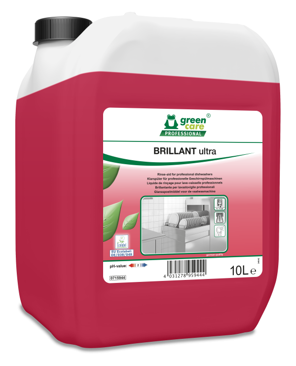 BRILLANT ultra by Green Care Professional is a highly effective rinse aid designed for hard water and harsh operating conditions. Thanks to natural citric acid, bioalcohol and resistant surfactants, the product neutralizes alkaline residues, prevents limescale deposits and provides fast drying and a deep shine on dishes, glasses and cutlery.
