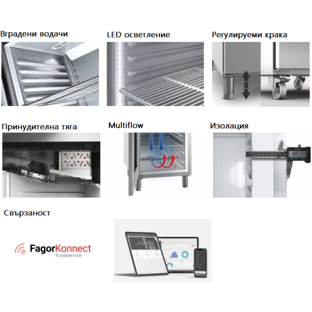 - Multiflow - Оптимална система за циркулация на въздуха, която гарантира балансирано и постоянно разпределение на въздуха в цялото оборудване, така че температурата остава равномерна. Помага за запазване на храната за по-дълго време.