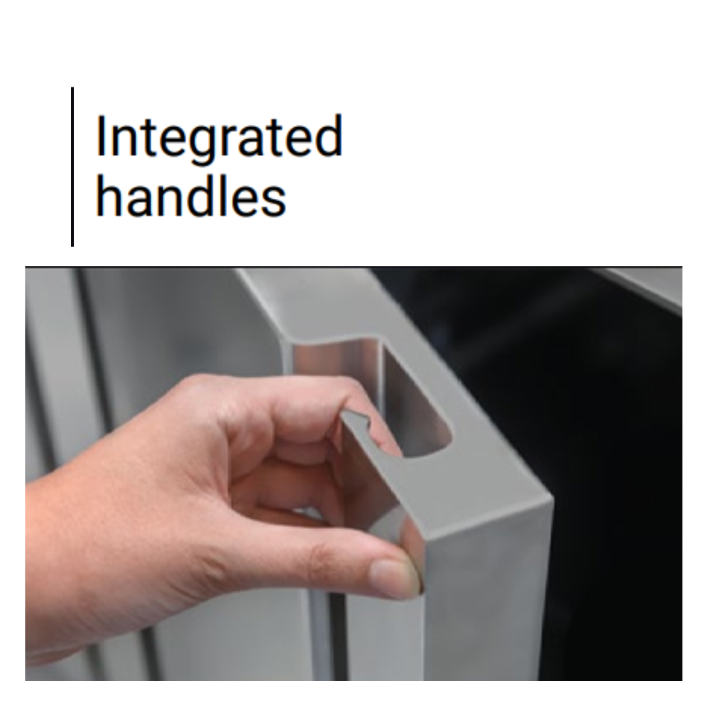- Врати от неръждаема стомана с ергономична, по цялата дължина, здрава, перфектно интегрирана дръжка, която осигурява практично отваряне и избягва събирането на прах и мръсотия.