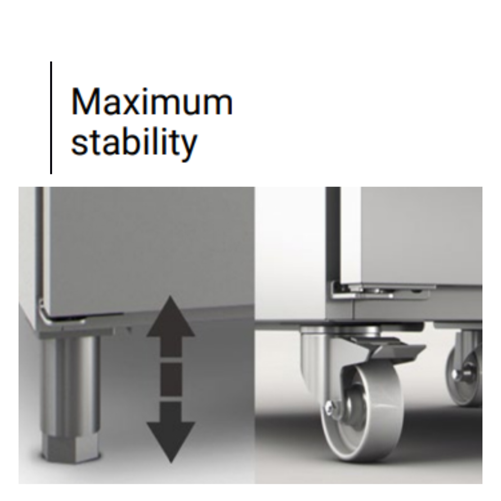 - Регулируеми по височина крака от неръждаема стомана. Височината на краката може да се регулира индивидуално (130 mm - 200 mm), за да позволи удобно почистване.