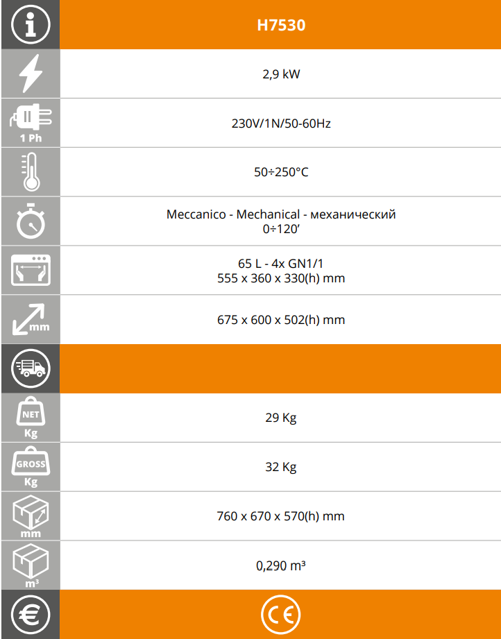 H7530 Fimar EasyLine е професионална компактна конвекционна фурна с овлажняване, създадена за малки и средни кухни, които се нуждаят от надеждност, равномерно печене и лесно управление. Моделът предлага капацитет за 4 GN1/1 тави и е подходящ за печива, месо, зеленчуци, полуфабрикати и регенериране на готови ястия.