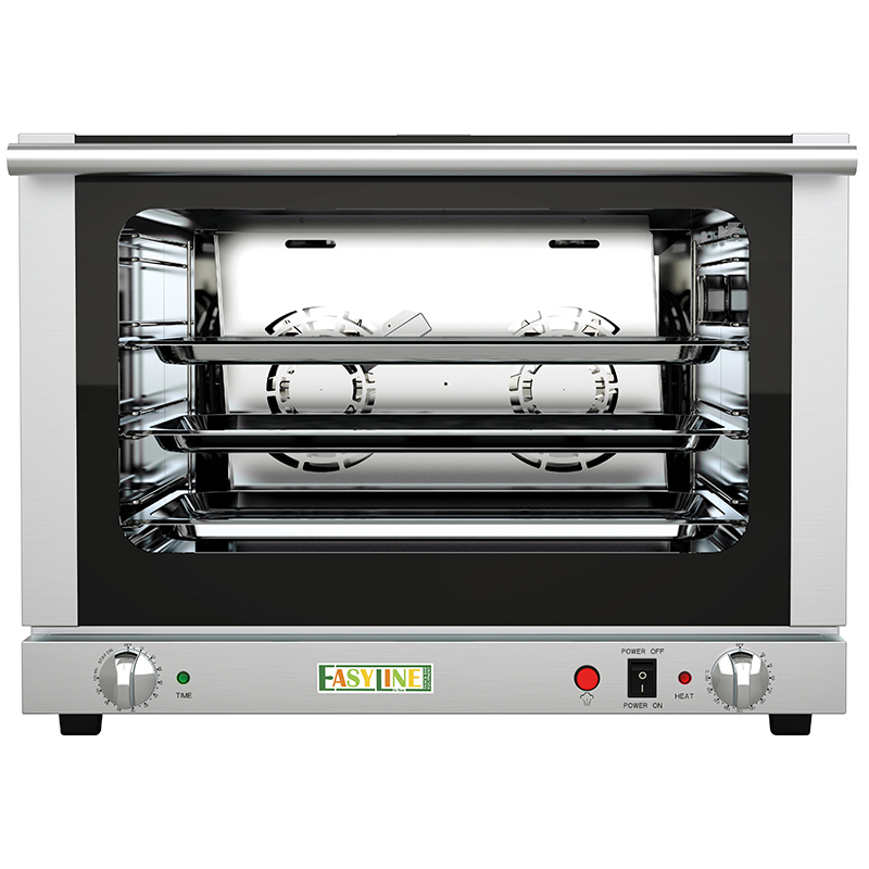 Фурната разполага с механичен термостат (50–250°C) и механичен таймер (0–120 мин) — решение, което осигурява максимална простота, надеждност и лесно обучение на персонала. Конструкцията е изцяло от неръждаема стомана, а двойното стъкло и вътрешното осветление позволяват добра видимост по време на работа.