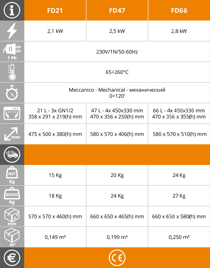 EasyLine FD21 е компактна професионална конвекторна фурна, създадена за малки кухни, кафетерии, сладкарници и обекти, които търсят надеждно и равномерно печене в ограничено пространство. Моделът предлага вентилаторна конвекция, механично управление и изцяло неръждаема конструкция, което гарантира дълъг живот и лесна поддръжка.