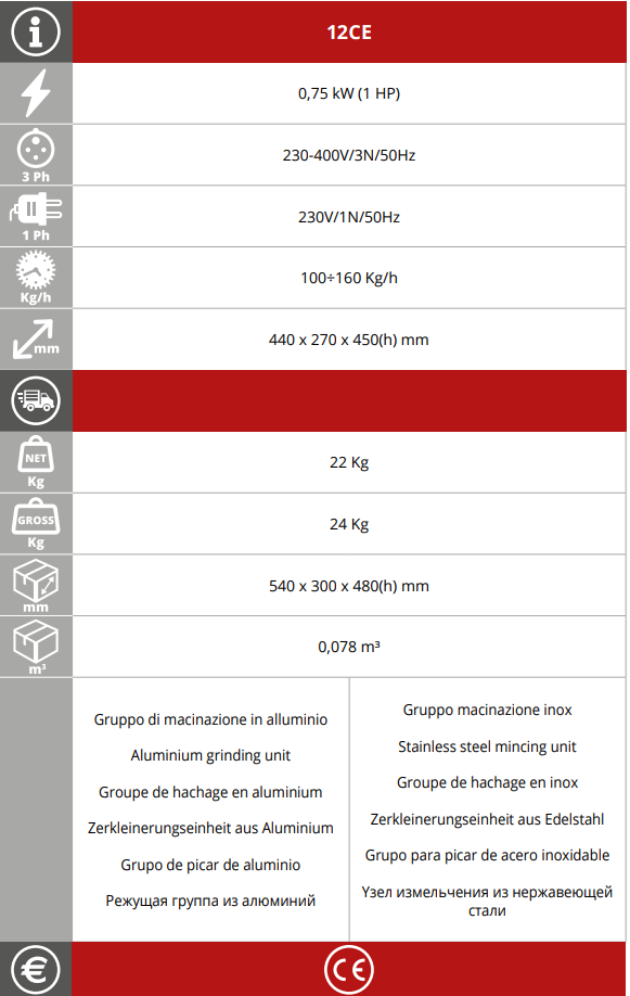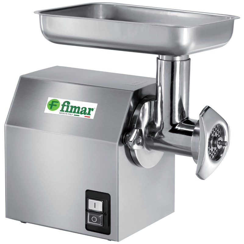Месомелачката Fimar 12CE е професионален модел, подходящ за месарници, магазини, ресторанти и малки производствени кухни. Машината разполага с мощност 0.75 kW, производителност 100–160 кг/ч и корпус и бункер от неръждаема стомана, което осигурява висока хигиена, устойчивост и лесна поддръжка.