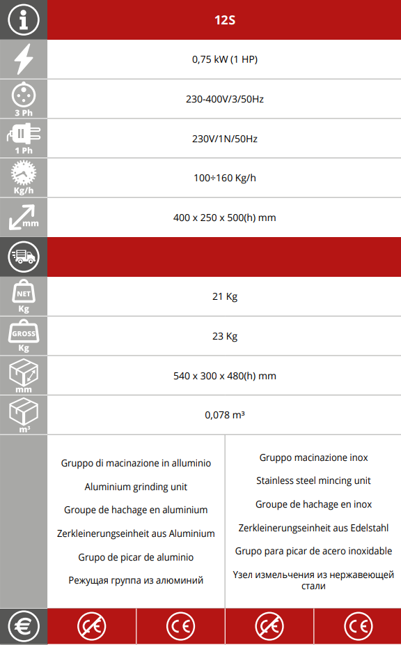 Месомелачката Fimar 12S е професионален модел, предназначен за месарници, супермаркети, ресторанти и малки производствени кухни. Машината разполага с мощност 0.75 kW, производителност 100–160 кг/ч и конструкция от полиран алуминий с бункер от неръждаема стомана, което осигурява добра хигиена, ниско тегло и лесна поддръжка.
