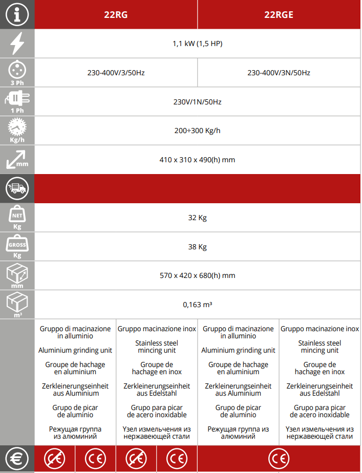 Месомелачките Fimar 22RG и 22RGE са професионални машини, предназначени за месарници, супермаркети, ресторанти и кухни с умерено до интензивно натоварване. И двата модела предлагат мощност 1.1 kW, производителност 200–300 кг/ч и неръждаема конструкция, която осигурява хигиена, издръжливост и лесна поддръжка.
