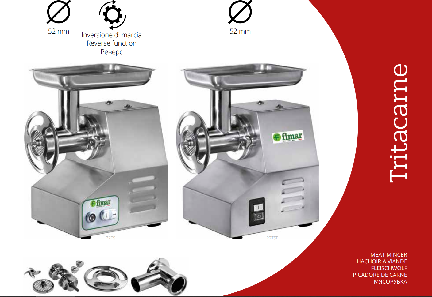 Професионални месомелачки Fimar 22TS / 22TSE – напълно разглобяем смилащ модул, 150–250 кг/ч