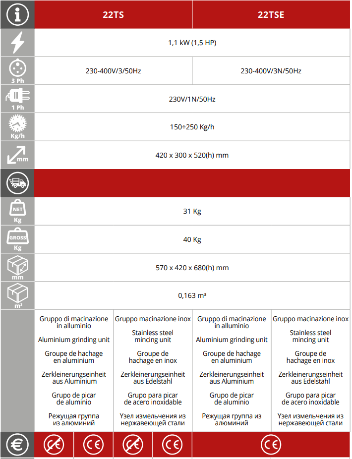 Месомелачките Fimar 22TS и 22TSE са професионални машини, проектирани за месарници, супермаркети, ресторанти и производствени кухни. Серията предлага мощност 1.1 kW, производителност 150–250 кг/ч и изцяло неръждаема конструкция, която гарантира хигиена, издръжливост и лесна поддръжка.