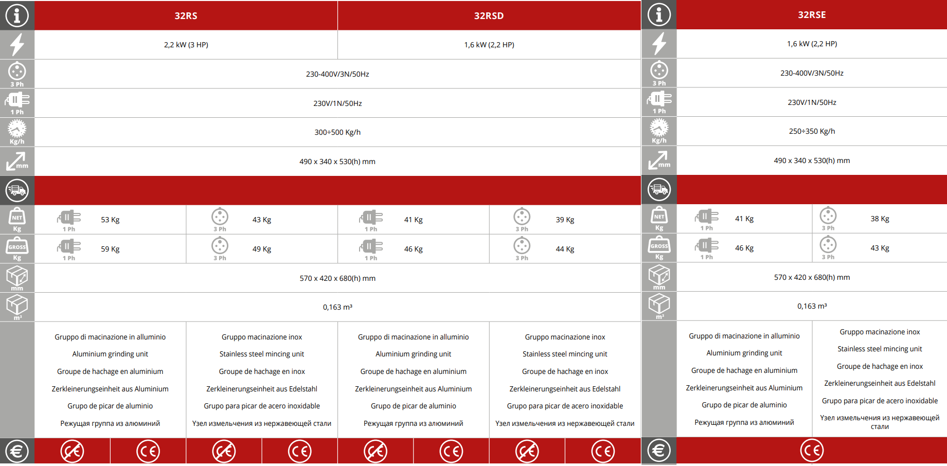 Месомелачките от серия Fimar 32RS, 32RSD и 32RSE са високопроизводителни професионални машини, проектирани за месарници, супермаркети, ресторанти и производствени кухни. Серията предлага мощни мотори (1.6–2.2 kW), производителност до 500 кг/ч и изцяло неръждаема конструкция, която гарантира хигиена, издръжливост и лесна поддръжка.
