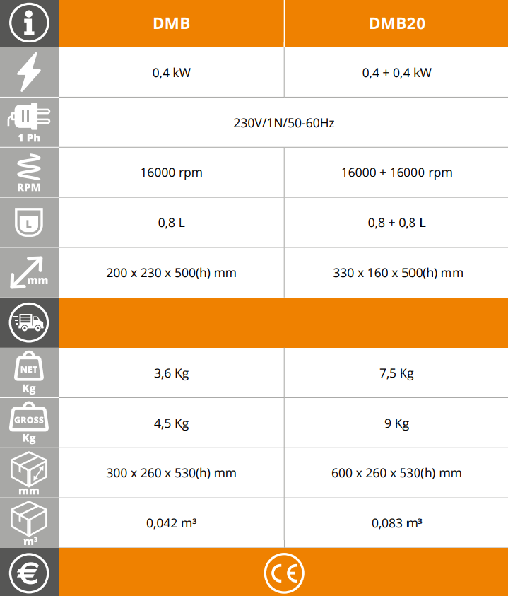 EasyLine Fimar DMB20 е професионален двоен миксер за фрапе, проектиран за интензивна работа в HORECA сектора. С две независими станции, всяка с 0,8 L неръждаема чаша и собствен мотор, уредът осигурява бърза подготовка на млечни шейкове, фрапета, коктейли и сорбета, без компромис в консистенцията и скоростта.