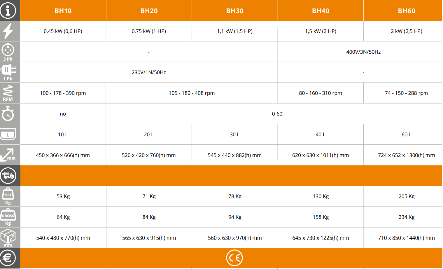 EasyLine BH60 е свободно стоящ планетарен миксер с купа 60 литра, мощност 2 kW и трифазно захранване (400V/3N/50Hz). Благодарение на 3‑скоростната механична скоростна кутия (74 - 150 - 288 rpm), моделът комбинира универсалността на планетарен миксер с устойчивостта на тестомесачка. Подходящ е за професионални пекарни, пицарии, сладкарници и ресторанти, където се изисква надеждно решение за месене на тесто за пица, хляб и бриоши, както и за разбиване на сметана, кремове и приготвяне на пандишпан.