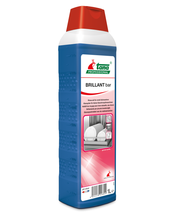 BRILLANT bar от Tana Professional е високоефективен препарат за плакнене, създаден специално за малки съдомиялни машини и работа при мека и средно твърда вода. Благодарение на високата концентрация и лесно дозиране, продуктът ускорява съхненето, неутрализира алкални остатъци и предотвратява варовикови отлагания, като осигурява равномерни резултати и блясък без следи.