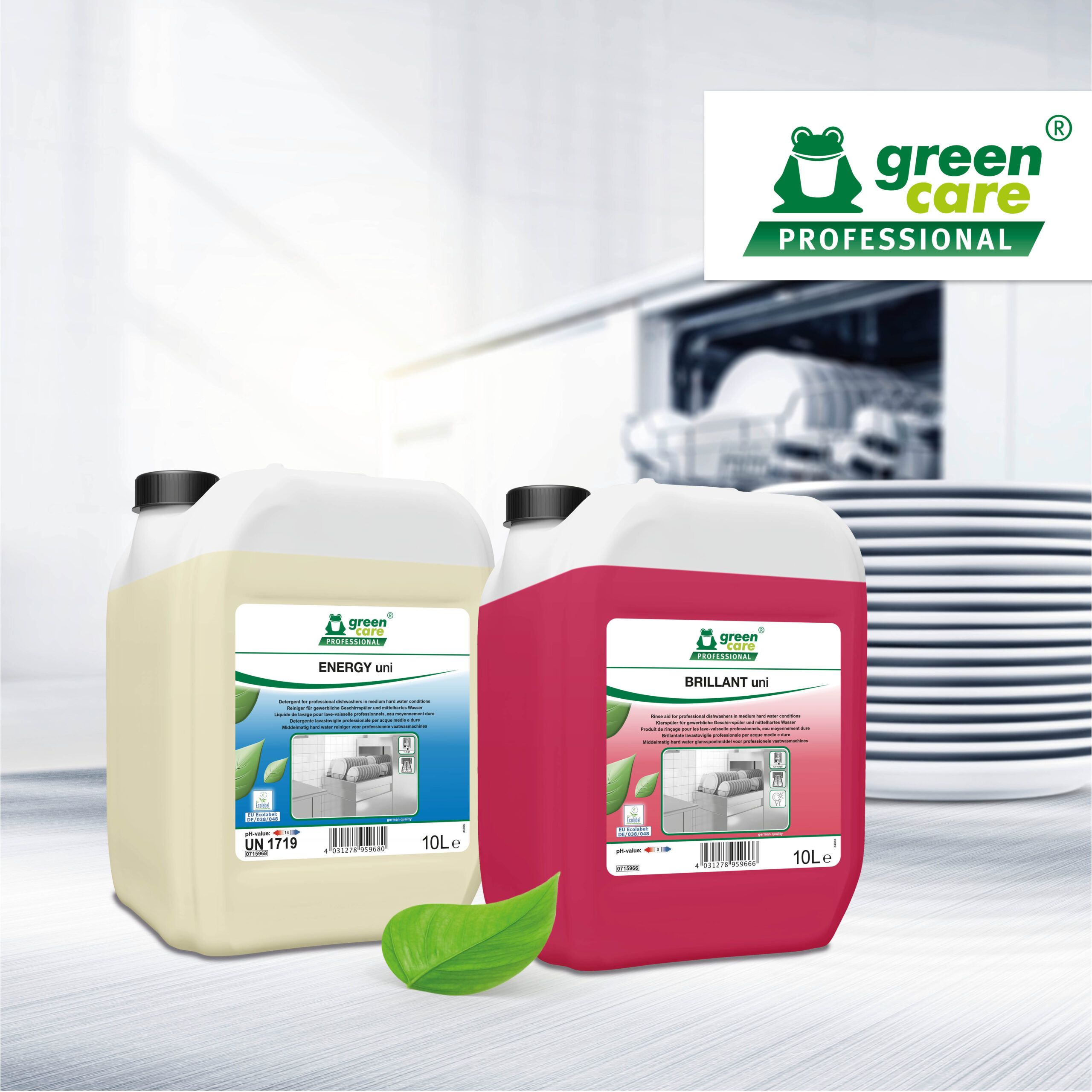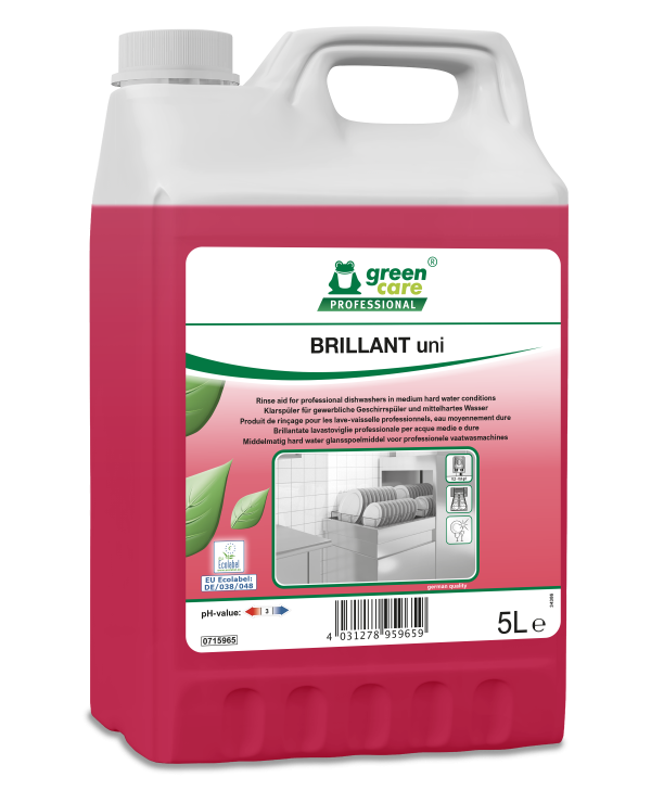 BRILLANT uni от Green Care Professional е универсален препарат за плакнене, създаден за средно твърда вода и трудни условия на работа. Формулата съдържа естествена лимонена киселина, биоалкохол и устойчиви ПАВ (повърхностно активни вещества), които ускоряват съхненето, като намаляват повърхностното напрежение между две среди, неутрализират алкални остатъци и осигуряват висок блясък без следи върху съдове, чаши и прибори.
