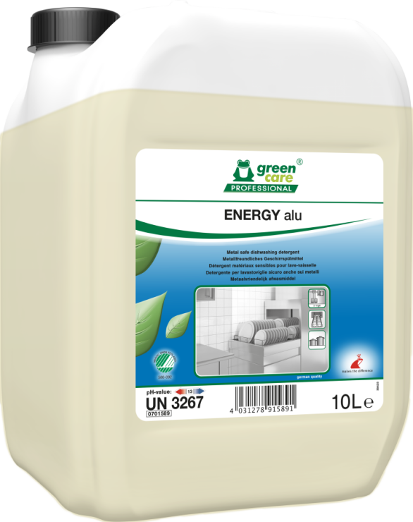 ENERGY alu от Green Care Professional е течен, концентриран препарат за професионални съдомиялни машини и предварително накисване, специално формулиран за чувствителни материали като алуминий, сребро, цветни метали, инокс и порцелан. Продуктът осигурява интензивно премахване на мазнини, нишесте, протеини и инкрустации, като същевременно е щадящ към повърхностите и безопасен за персонала.