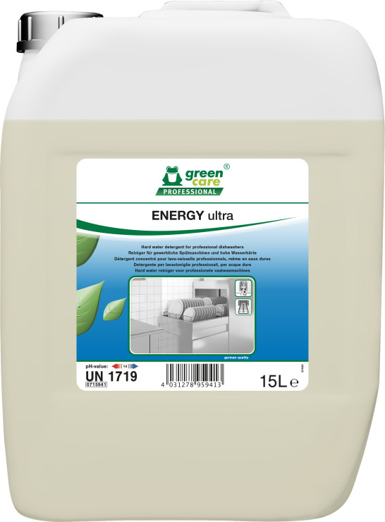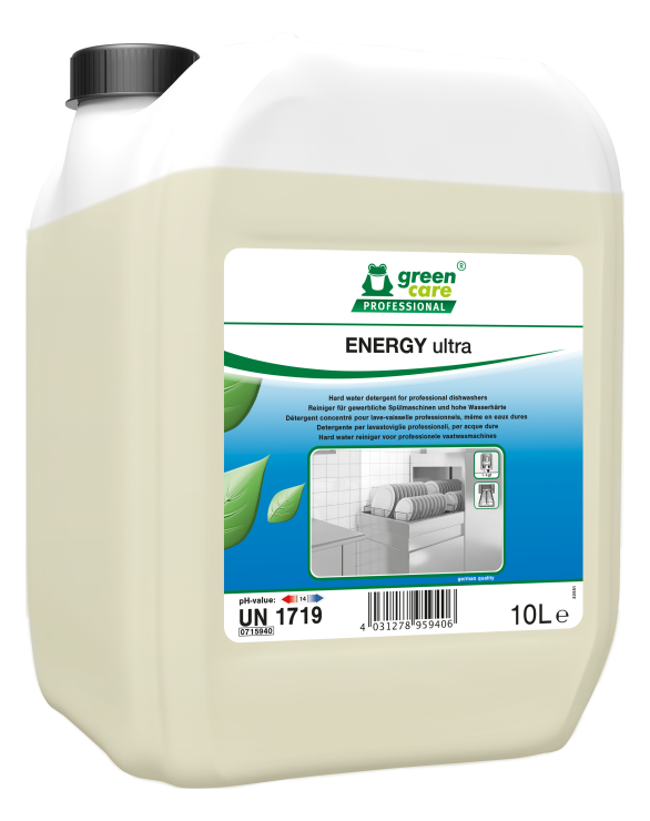 ENERGY ultra от Green Care Professional е високоефективен препарат за професионални съдомиялни машини, специално създаден за работа при твърда вода и екстремни натоварвания. Формулата е базирана на устойчив комплексообразуващ агент, който предотвратява варовикови отлагания и осигурява перфектно обезмасляване и премахване на петна от чай, кафе и загорели остатъци.