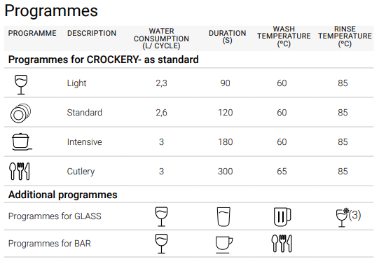 - Избираеми от потребителя програми според използването на оборудването (стъкло, чинии и бар), както и специфични за машината програми.