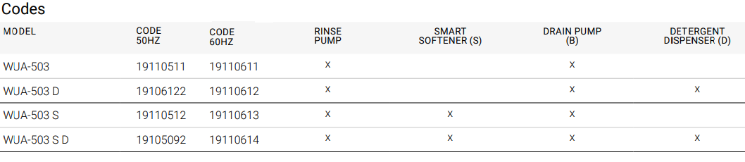 - Опции за сензоризация (Z), включително: Контрол на дозирането на химикали (DA); Контрол на ниско ниво на химикали посредством сонди (L), предлагани като аксесоар, с предупреждение на контролния панел. (Стандартно включени при модели с омекотител за вода (S)).