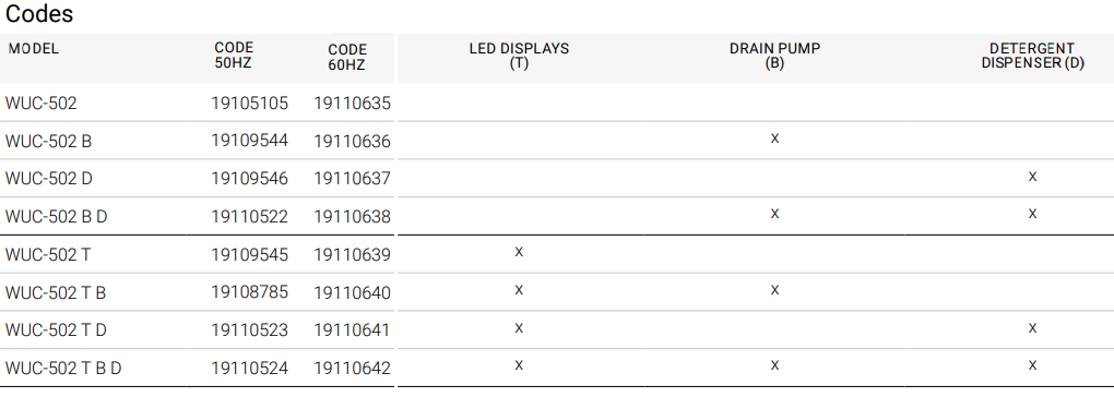 - Модел с дренажна помпа (B): WUC-502 B (Мръсната вода за измиване се оттича частично преди изплакване, което позволява: 1/Избягване на ненужно разхищение на препарат чрез по-бавно замърсяване на водата. 2/Намаляване на разходите за енергия по време на фазата на нагряване на водата за измиване чрез непрекъснато регенериране на водата за измиване.)