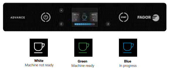 - Осветени бутони и многоцветен бутон СТАРТ, който променя цвета си в зависимост от състоянието на машината.