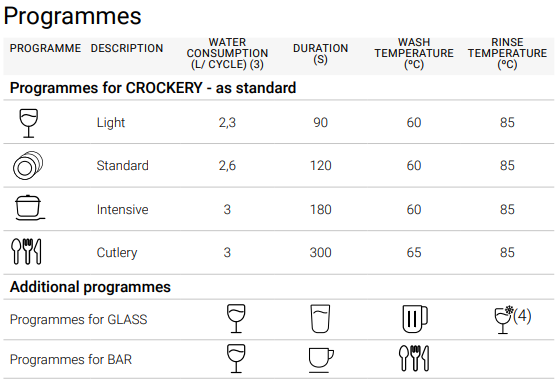 - Избираеми от потребителя програми според използването на оборудването (стъкло, чинии и бар), както и специфични за машината програми.