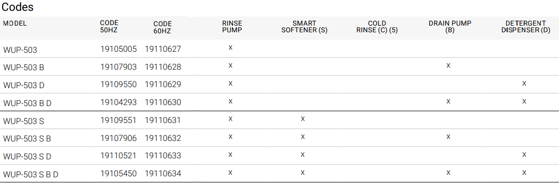 - Модел с дренажна помпа: WUP-503 B / WUP-503 S B (Мръсната вода за измиване се оттича частично преди изплакване, което позволява: 1/Избягване на ненужно разхищение на препарат чрез по-бавно замърсяване на водата. 2/Намаляване на разходите за енергия по време на фазата на нагряване на водата за измиване чрез непрекъснато регенериране на водата за измиване.)