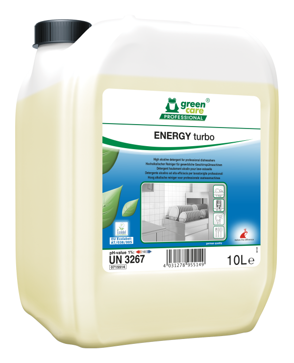 ENERGY turbo от Green Care Professional е високоефективен, силно алкален препарат, предназначен за професионални съдомиялни машини, включително многотанкови и конвейерни системи. Формулата е създадена за справяне с най-упоритите хранителни остатъци, включително загорели мазнини, нишесте и протеини, като осигурява бързи и равномерни резултати.