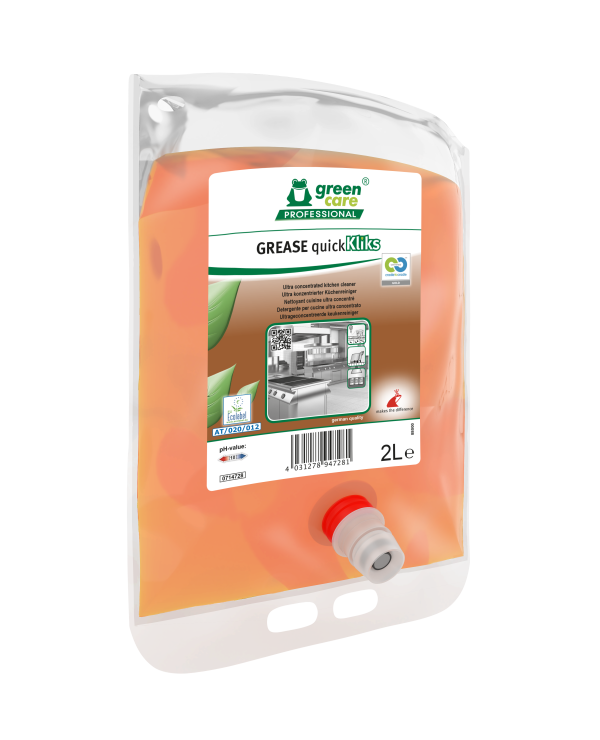 GREASE quickKliks от Green Care Professional е ултраконцентриран кухненски препарат, създаден за професионално почистване на водоустойчиви повърхности в хранителни зони. Благодарение на системата quickKliks, продуктът осигурява безопасно дозиране, икономична употреба и висока ефективност при ниска концентрация. С приятен аромат на портокал и формула от растителни суровини, GREASE quickKliks е сертифициран по водещи екологични стандарти.